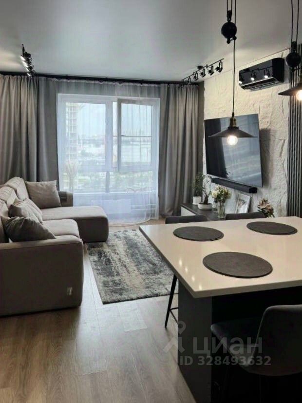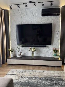 Просторная кухня-гостиная, дизайнерская ТВ зона под камень с подсветкой и подвесной тумбой, много свободного места.