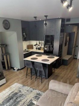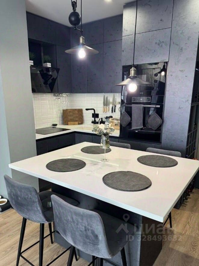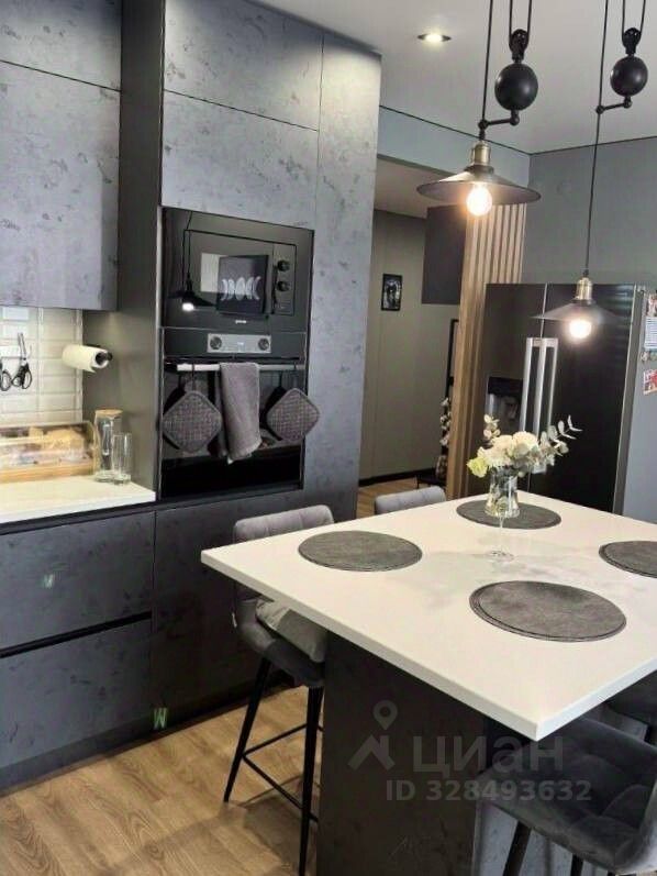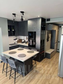 Кухня встроенная, посудомойка, вытяжка, микроволновка, духовой шкаф, подсветка, остров с каменной столешницей в качестве обеденной зоны.