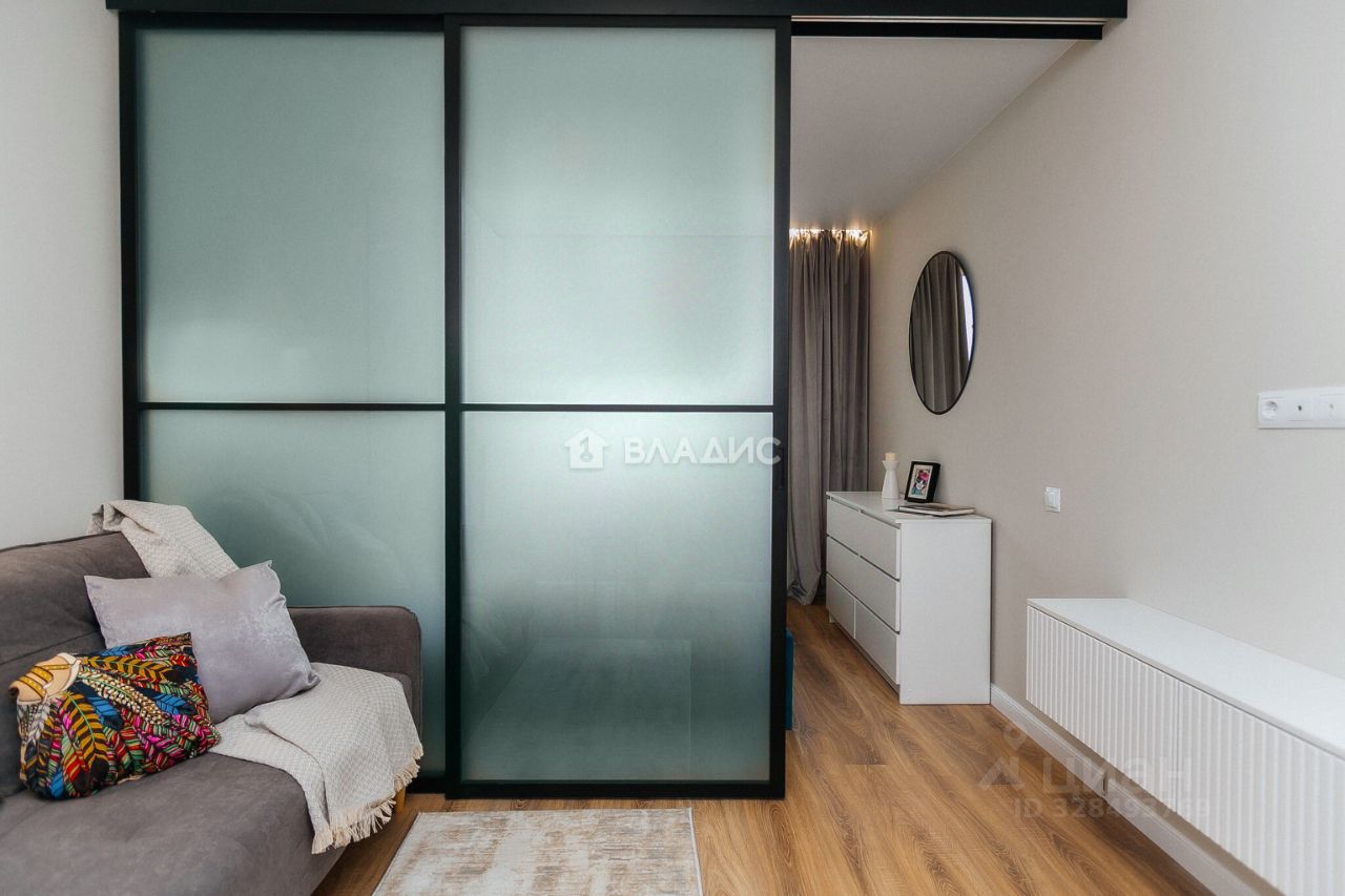 Просторная комната разделена на две полноценные зоны раздвижной перегородкой из матового стекла