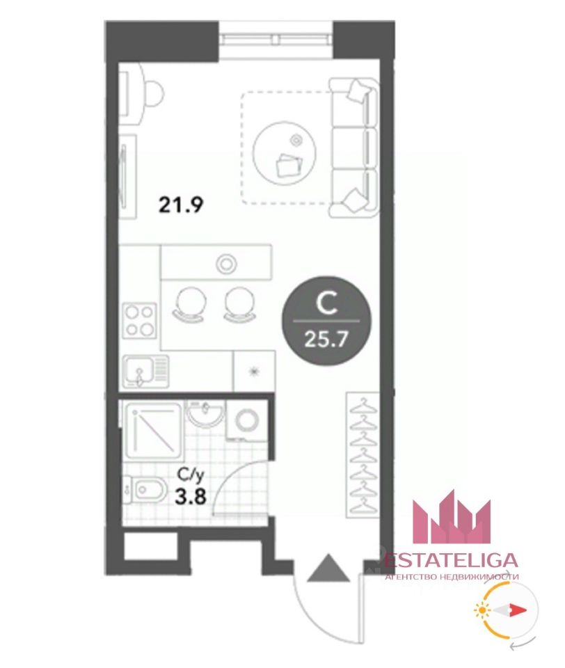 Id 62325. Продаётся студия общей площадью 25,7 кв.м. в комплексе бизнес-класса Voxhall.