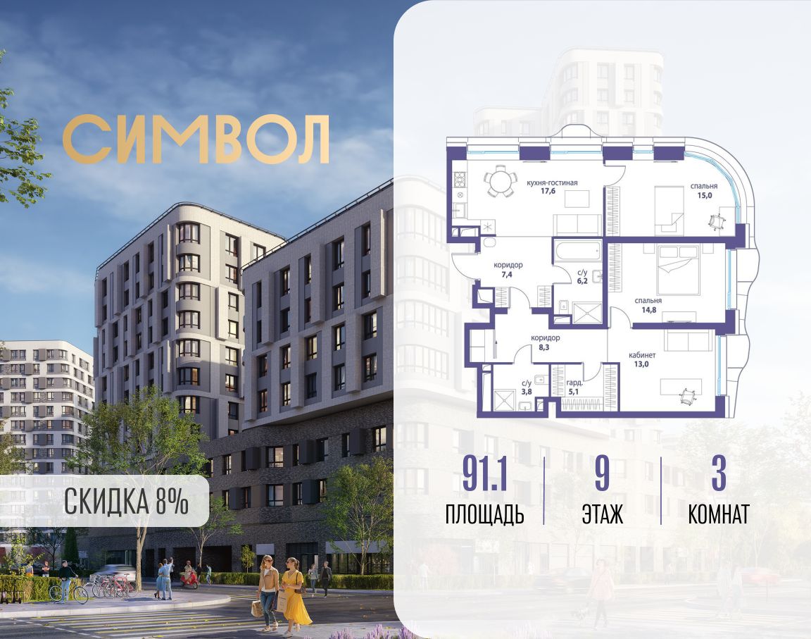 Продается 3-комнатная квартира от застройщика: общая площадь 91.10 м², жилая 42.80 м², кухня 17.60 м², 9-й этаж, жилой квартал "Вдохновение", корпус 34 (секция 1). Срок сдачи: 4 квартал 2027 года.