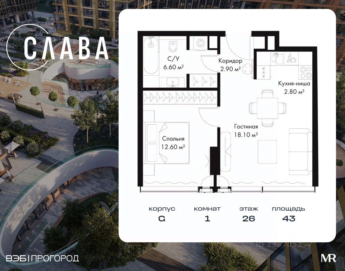 В продаже 1-комнатная квартира площадью 43 м² на 26-м этаже корпуса G.