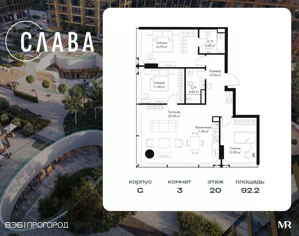 В продаже 3-комнатная квартира площадью 92.20 м² на 20-м этаже корпуса G.