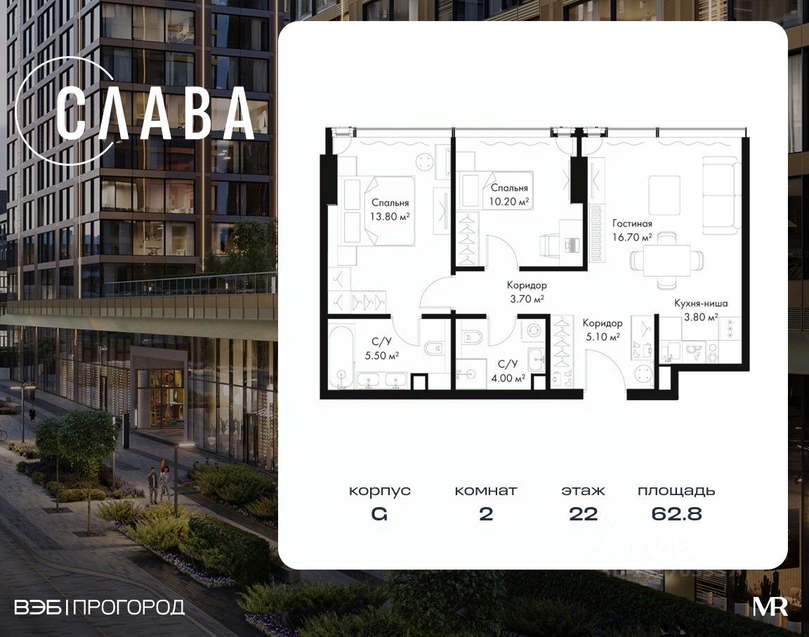 В продаже 2-комнатная квартира площадью 62.80 м² на 22-м этаже корпуса G.
