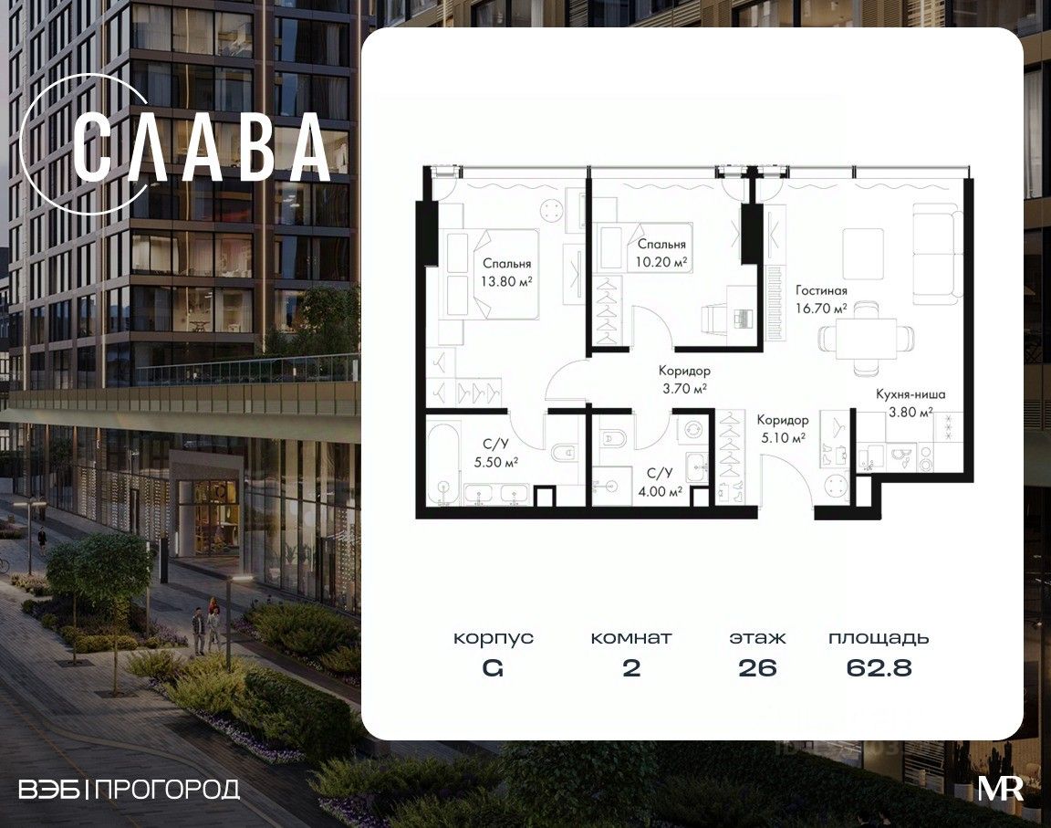 В продаже 2-комнатная квартира площадью 62.80 м² на 26-м этаже корпуса G.