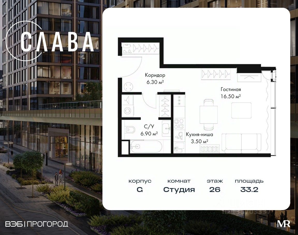 В продаже студия площадью 33.20 м² на 26-м этаже корпуса G.