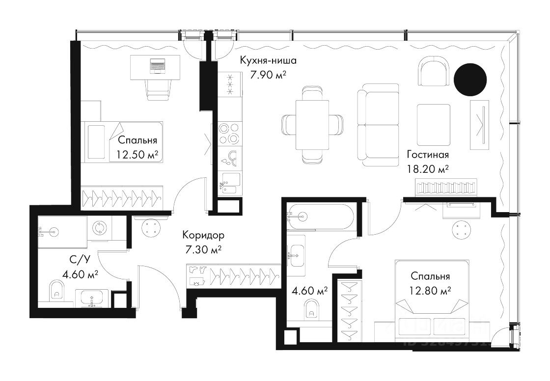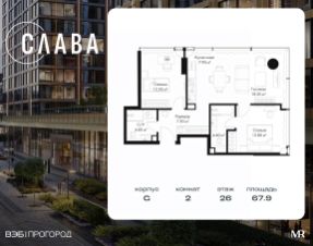 В продаже 2-комнатная квартира площадью 67.90 м² на 26-м этаже корпуса G.