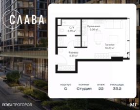 В продаже студия площадью 33.20 м² на 22-м этаже корпуса G.