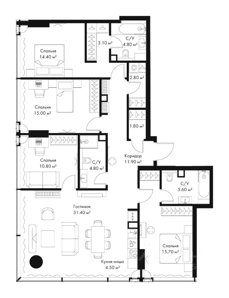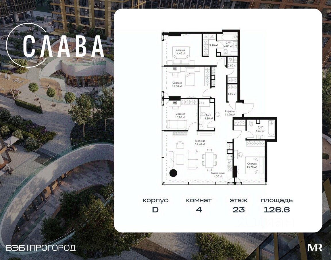 В продаже 4-комнатная квартира площадью 126.60 м² на 23-м этаже корпуса D.