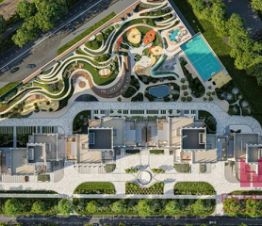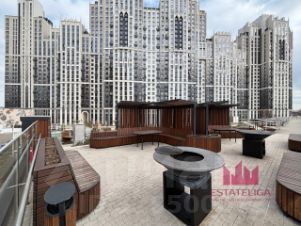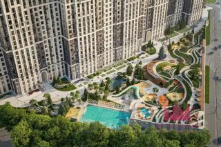 асса с архитектурой в духе ар-деко: выразительные колонны, декоративные барельефы и строгие вертикали. В квартирах высокие окна и потолки до 6,5 метров в пентхаусах, встречаются форматы с каминами и террасами. Для жителей устроили общую гостиную с кофе-баром и выходом на террасу, детскую комнату, приватный фитнесс с залом и зонами восстановления. Во дворе — площадки для баскетбола и мини-футбола, беговые дорожки и беседки, пруд и зона барбекю. На первых этажах открылись супермаркет, ресторан и сервисы для повседневной жизни.
