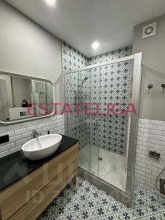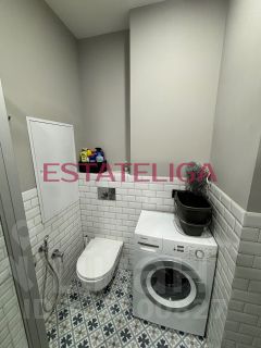 В апартаменте есть вся необходимая мебель и бытовая техника для проживания. Гардеробная полностью обустроена под хранение, в спальне двуспальная кровать с прикроватными тумбами. На кухне установлена варочная плита и духовой шкаф фирмы Bosch, а также холодильник и микроволновая печь. В гостиной зоне расположен раскладной диван.