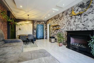 В гостиной (26,6 кв. м) диван, электрический камин-обогреватель, кондиционер.