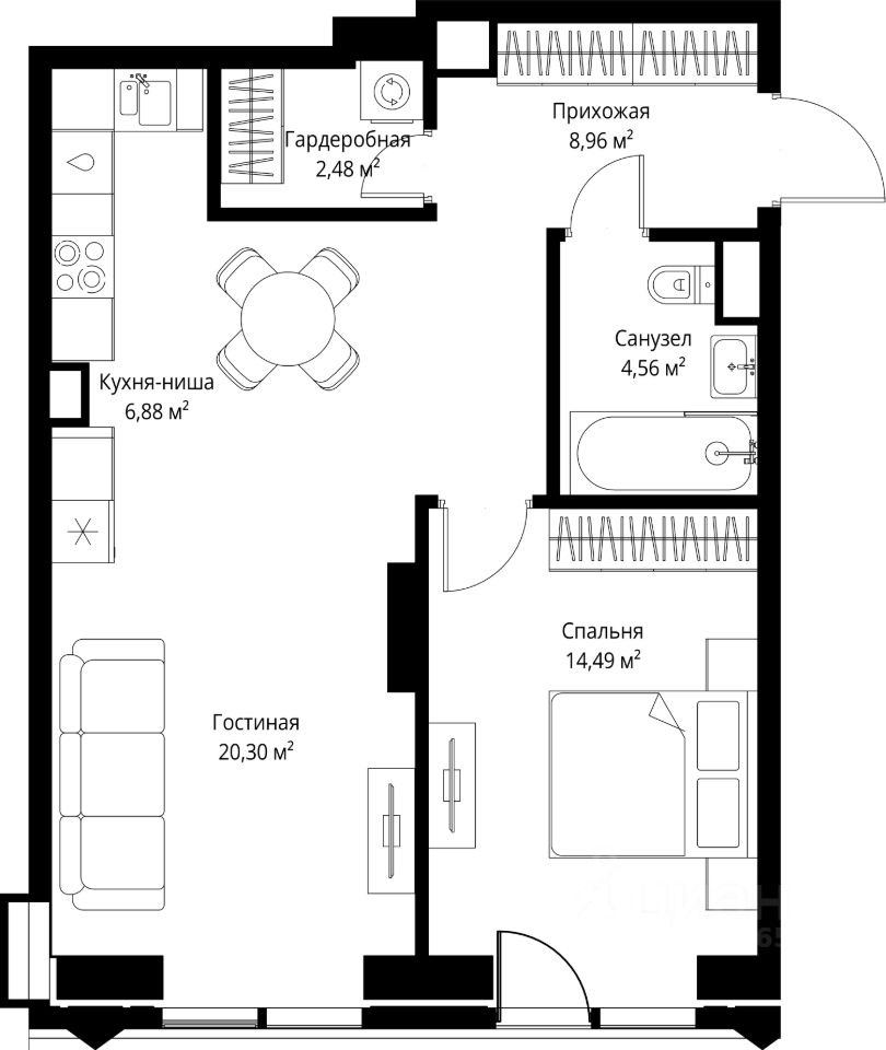 В продаже квартира площадью 57.67 м² с предчистовой отделкой на 6 этаже 55 этажного дома. Квартира расположена в корпусе Анна.