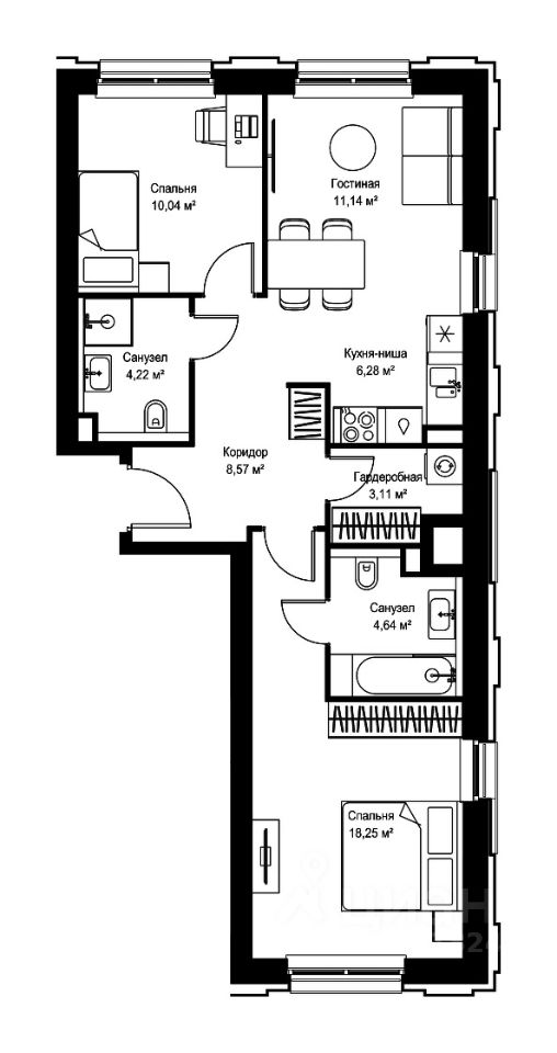 Продаётся 2-комнатная квартира общей площадью 66.25 м² без отделки в ЖК "Селигер Сити" на 8-м этаже башни Лисицкого.