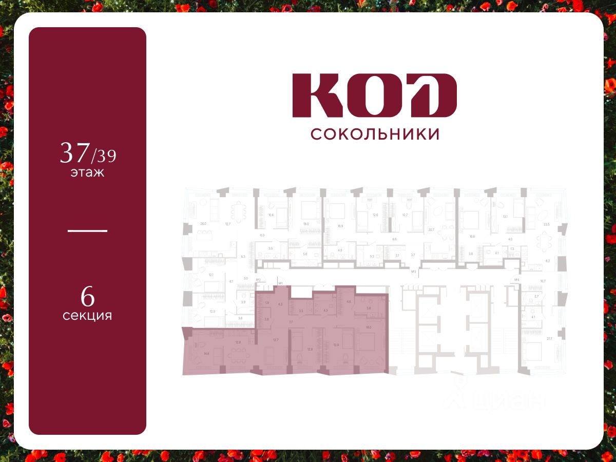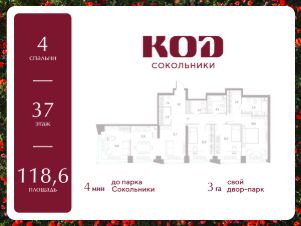 В семейном жилом квартале, расположенном в окружении более 500 га леса и объектов исторического наследия, продается 4-комнатная квартира площадью 118.6 кв. м без отделки. Квартира расположена на 37 этаже 39-этажного корпуса 2.2 жилого квартала бизнес-класса КОД Сокольники от девелопера Новая Эра.