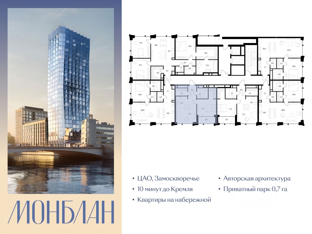 В элитном жилом комплексе "Монблан" на Шлюзовой набережной в Замоскворечье напрямую от девелопера ГК "Галс-Девелопмент" представлена 1-комнатная квартира квартира на 7 этаже общей площадью 57.10 м².