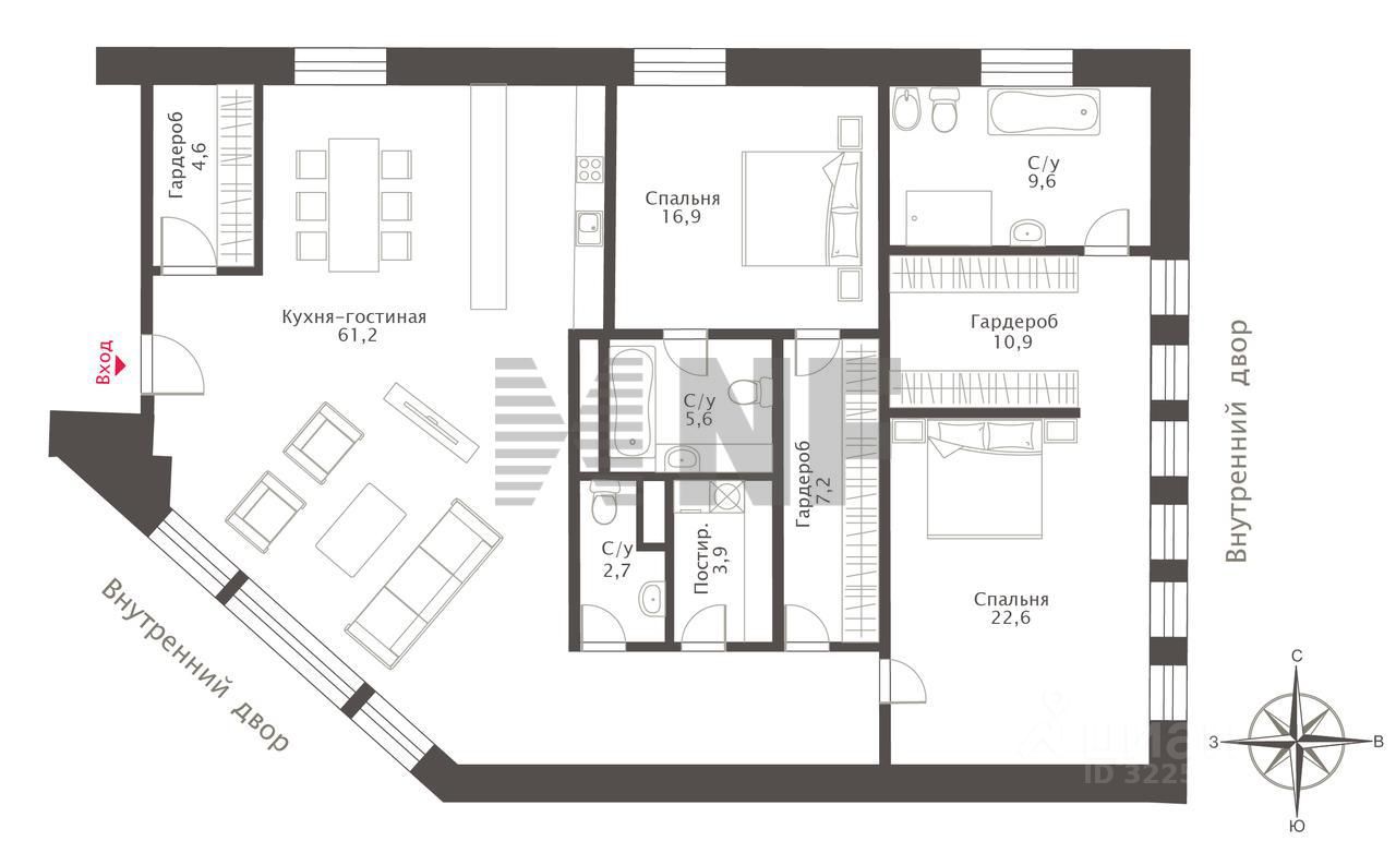 Планировка: гостиная-кухня, мастер-спальня с ванной и гардеробной, дополнительная спальня с ванной комнатой, гостевой санузел.