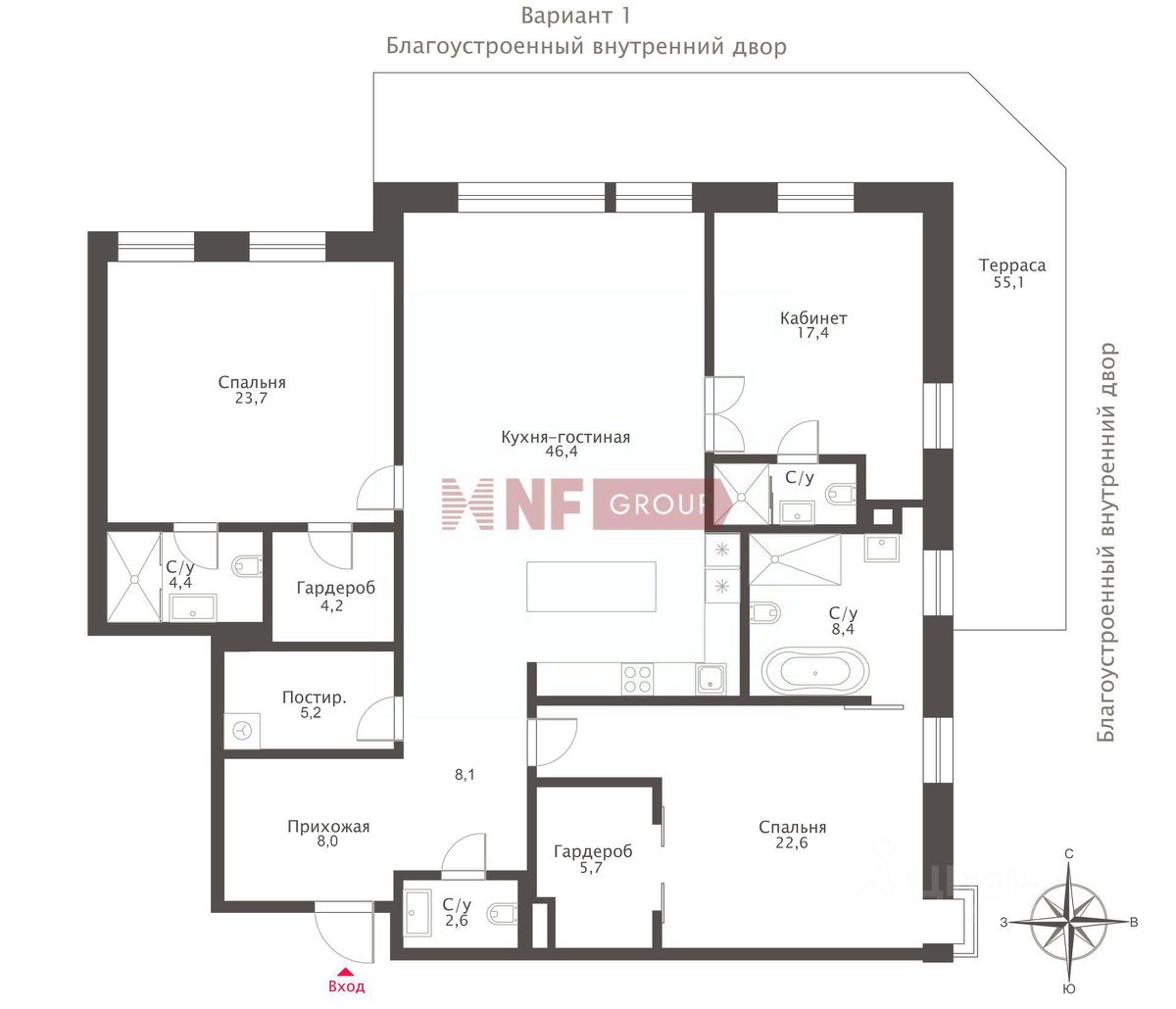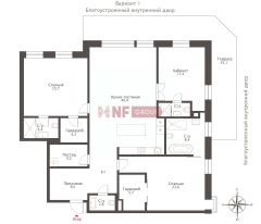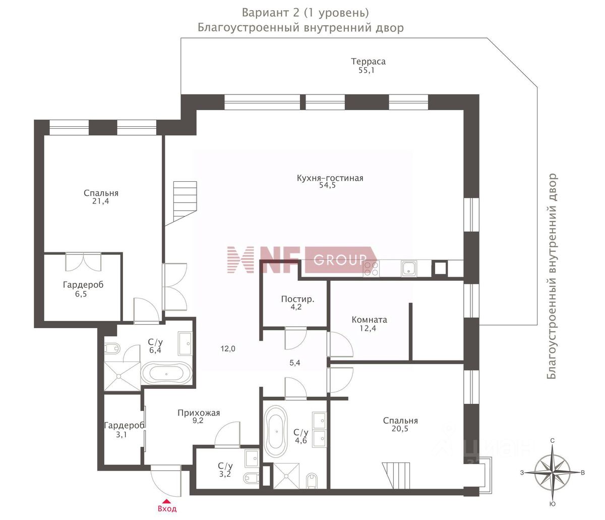 Планировка: возможна организация просторной кухни-гостиной, мастер-спальни с ванной комнатой и гардеробной, дополнительных спален или кабинета, постирочной, гостевого санузла. Преимущество квартиры — выход в патио.