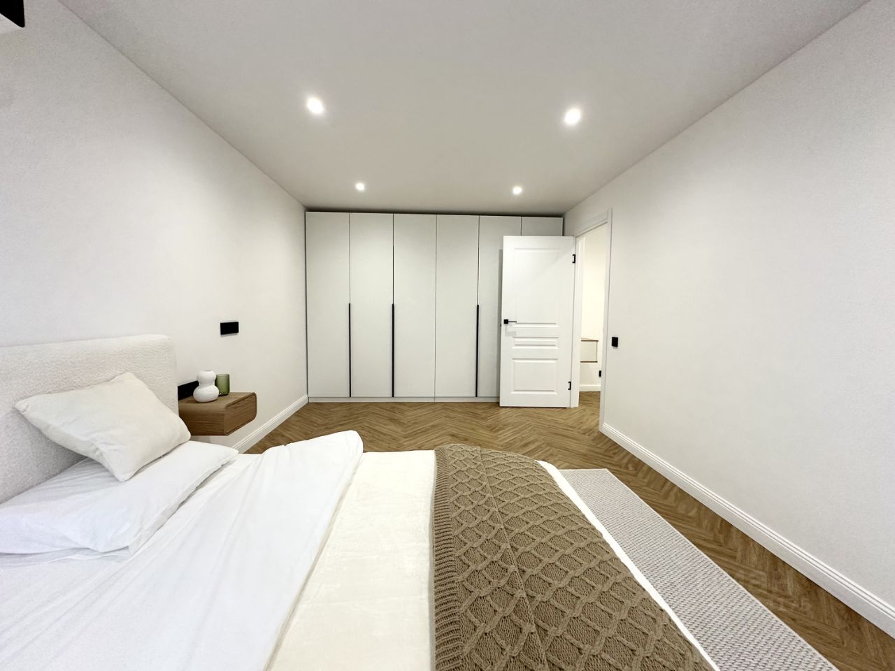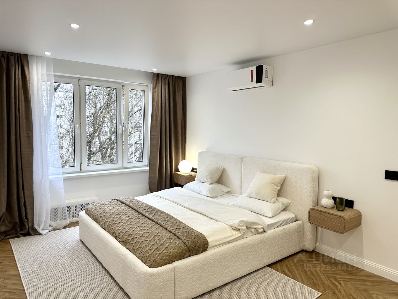 Уютная спальня с двуспальной кроватью, встроенными шкафами для хранения и кондиционером.