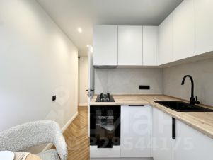 Кухня оборудована всем необходимым: современный кухонный гарнитур, холодильник, варочная панель, вытяжка, посудомоечная машина — удобное пространство для жизни и готовки.