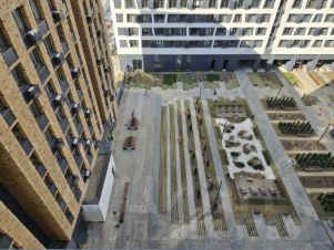 Двор без машин, на территории располагаются зоны отдыха в тени и детская площадка, рядом фитнес центр с бассейном 25м и коворкинг The Work.
