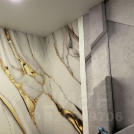 * Кухня-гостиная (17 м²): Сердце квартиры. Стены оформлены акцентным панно с мраморной текстурой, в которое идеально интегрированы двери скрытого монтажа (Invisible). Это создает эффект единого арт-пространства.