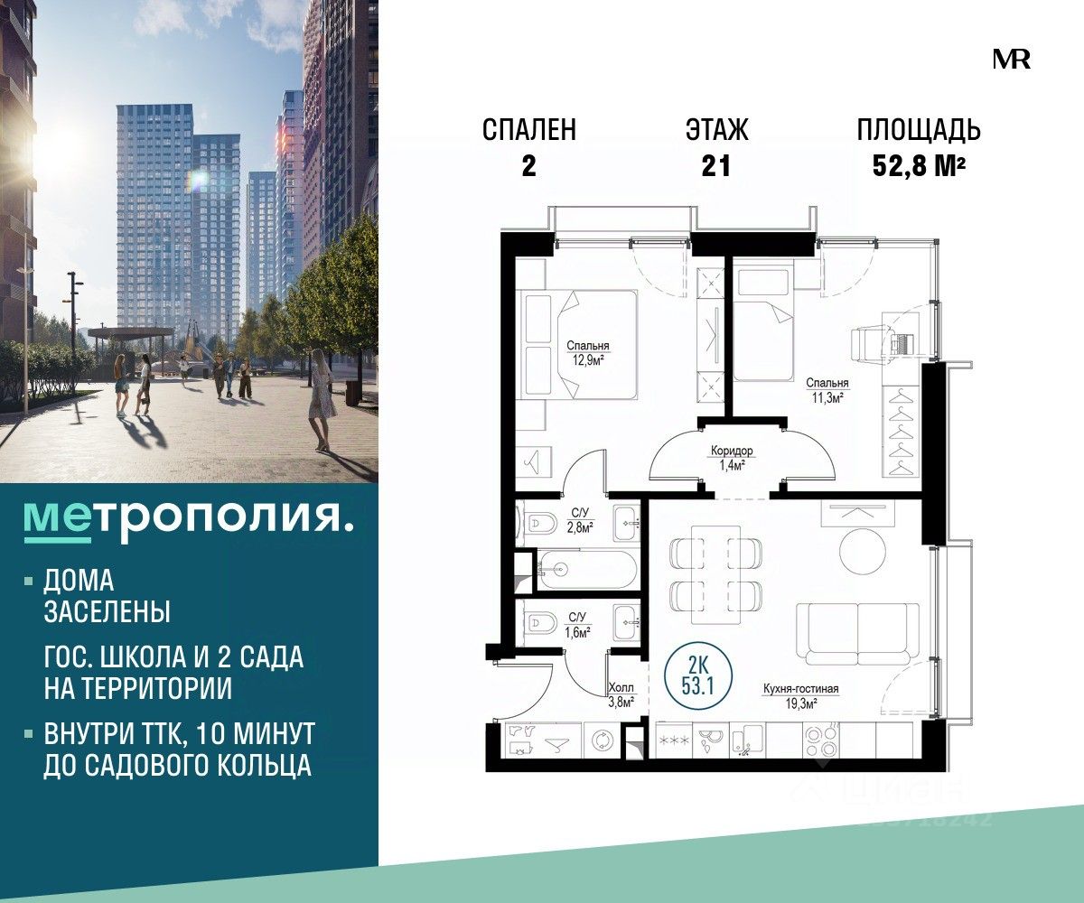 Продаётся 2-комнатная квартира общей площадью 52.80 м², на 21 этаже.