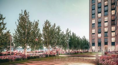 Высотные здания "Метрополии" образуют благоустроенное дворовое пространство на 4,6 га, которое украсят более 400 деревьев и несколько сотен кустарников, живописные цветочные клумбы и аккуратные газоны.