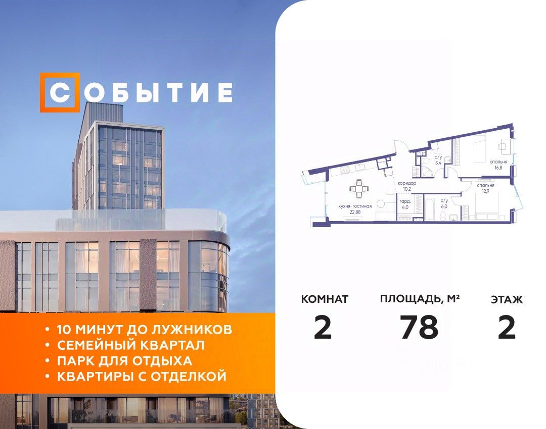 СОБЫТИЕ.6 — финальный дом парк-квартала СОБЫТИЕ на Мосфильмовской. Переезжайте в уже сформированный квартал с готовой инфраструктурой и парком! Премиальный жилой комплекс в престижном районе Москвы предлагает стильную архитектуру, продуманное благоустройство и великолепно разнообразие общественных пространств. Свой парк прямо возле дома!