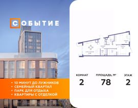 В продаже 1-к квартира от застройщика. Общая площадь 78.00, жилая 29.70, кухня 22.7. Квартира расположена на 2 этаже жилого квартала "Событие-6", корпус 2, Секция 1. Квартира без отделки. Срок сдачи: 4 кв. 2029 года.