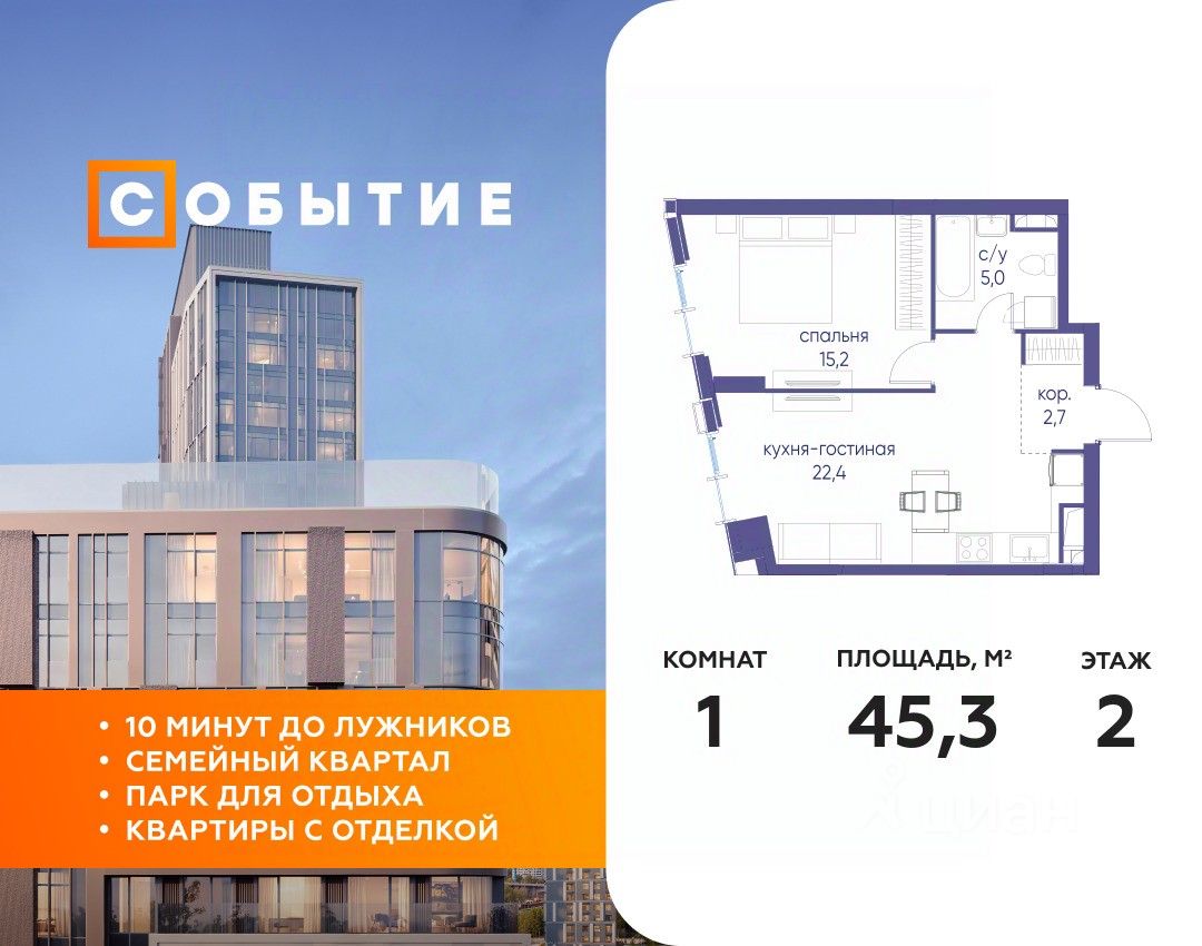 В продаже 1-к квартира от застройщика. Общая площадь 45.30, жилая 15.20, кухня 21.8. Квартира расположена на 2 этаже жилого квартала "Событие-6", корпус 2, Секция 1. Квартира без отделки. Срок сдачи: 4 кв. 2029 года.