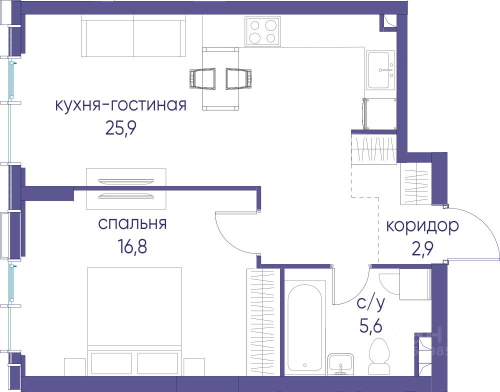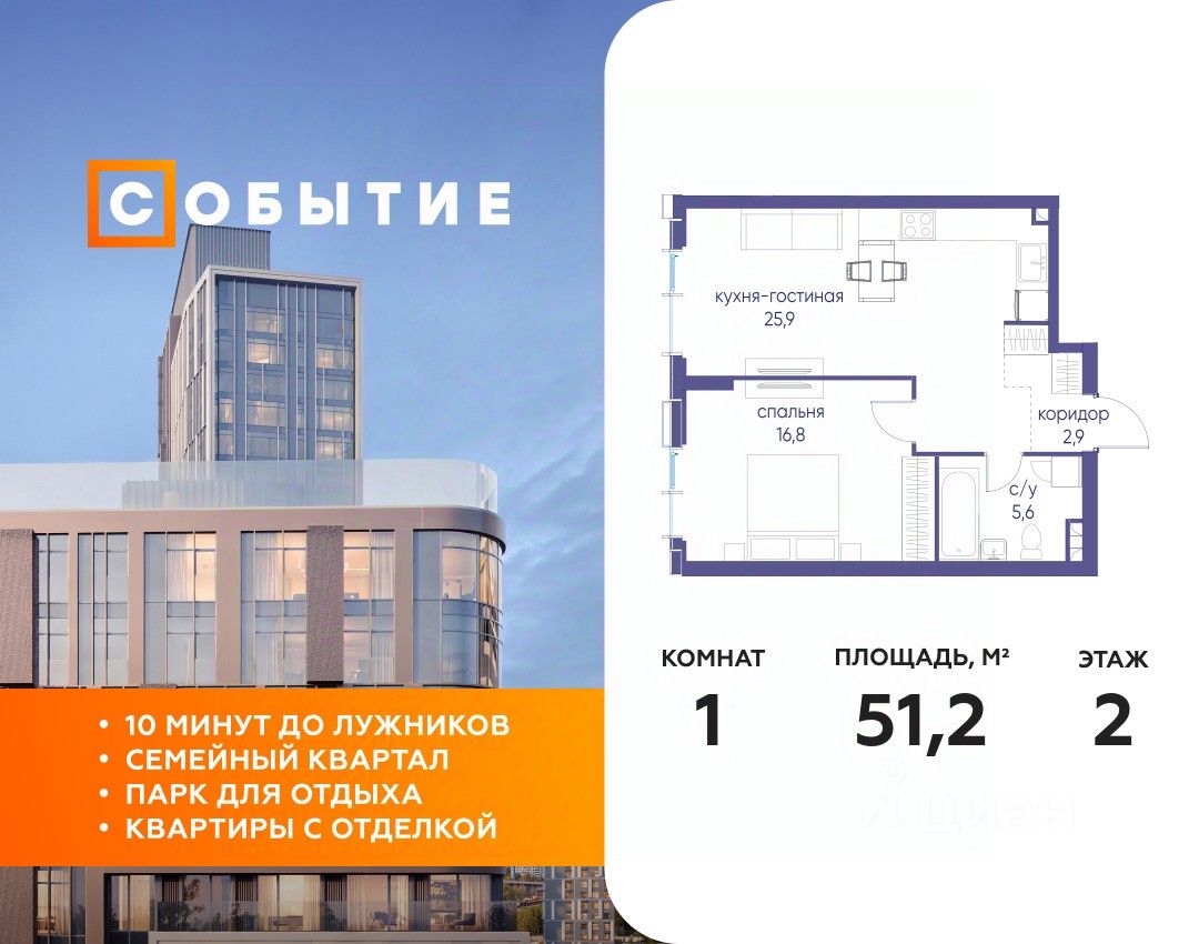 В продаже 1-к квартира от застройщика. Общая площадь 51.20, жилая 16.80, кухня 25.9. Квартира расположена на 2 этаже жилого квартала "Событие-6", корпус 2, Секция 1. Квартира без отделки. Срок сдачи: 4 кв. 2029 года.