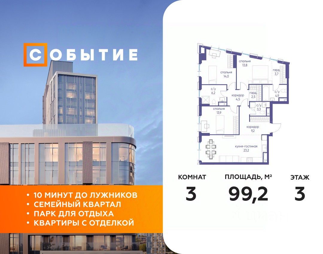 СОБЫТИЕ.6 — финальный дом парк-квартала СОБЫТИЕ на Мосфильмовской. Переезжайте в уже сформированный квартал с готовой инфраструктурой и парком! Премиальный жилой комплекс в престижном районе Москвы предлагает стильную архитектуру, продуманное благоустройство и великолепно разнообразие общественных пространств. Свой парк прямо возле дома!