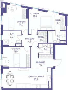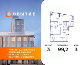 В продаже 2-к квартира от застройщика. Общая площадь 99.20, жилая 45.40, кухня 23. Квартира расположена на 3 этаже жилого квартала "Событие-6", корпус 2, Секция 1. Квартира без отделки. Срок сдачи: 4 кв. 2029 года.