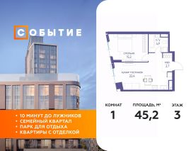 В продаже 1-к квартира от застройщика. Общая площадь 45.20, жилая 15.20, кухня 21.8. Квартира расположена на 3 этаже жилого квартала "Событие-6", корпус 2, Секция 1. Квартира без отделки. Срок сдачи: 4 кв. 2029 года.