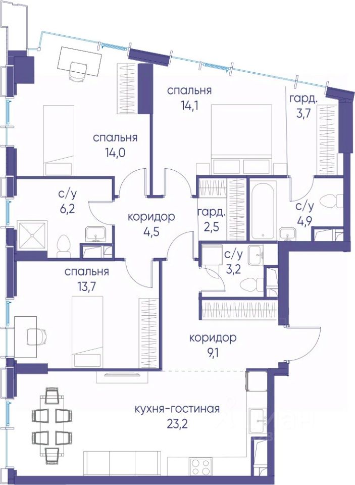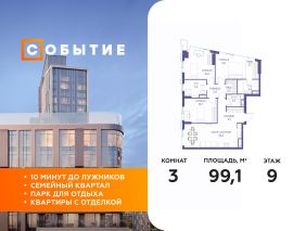 В продаже 2-к квартира от застройщика. Общая площадь 99.10, жилая 45.50, кухня 23. Квартира расположена на 9 этаже жилого квартала "Событие-6", корпус 2, Секция 1. Квартира без отделки. Срок сдачи: 4 кв. 2029 года.