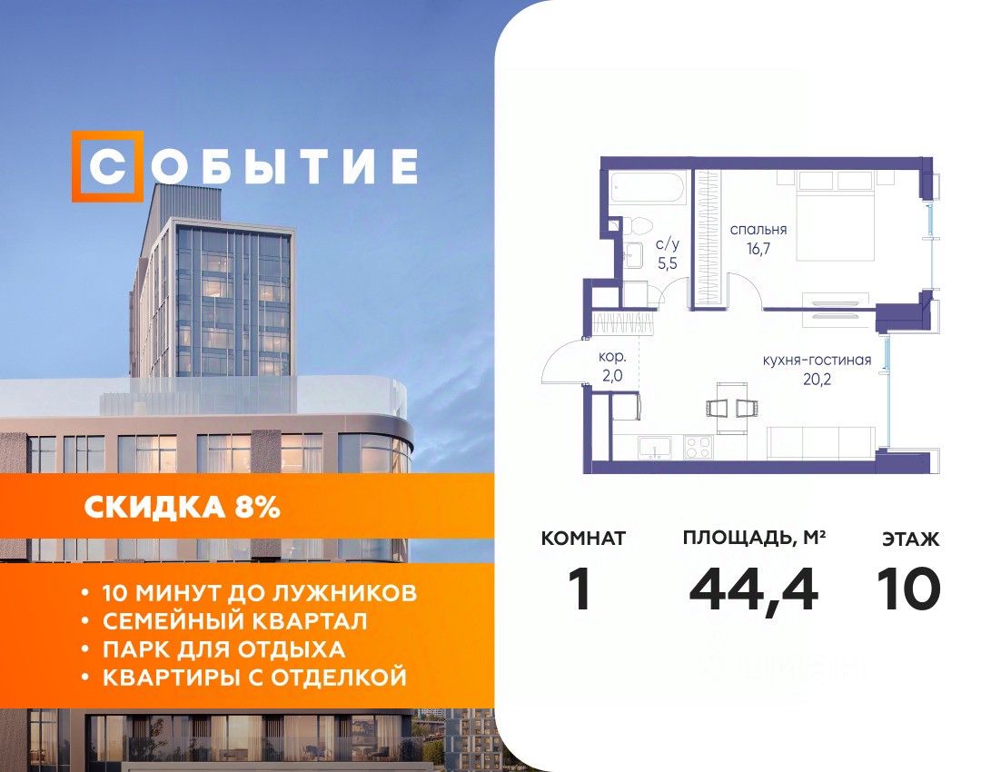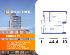В продаже 1-к квартира от застройщика. Общая площадь 44.40, жилая 16.70, кухня 20.1. Квартира расположена на 10 этаже жилого квартала "Событие-6", корпус 2, Секция 1. Квартира без отделки. Срок сдачи: 4 кв. 2029 года.