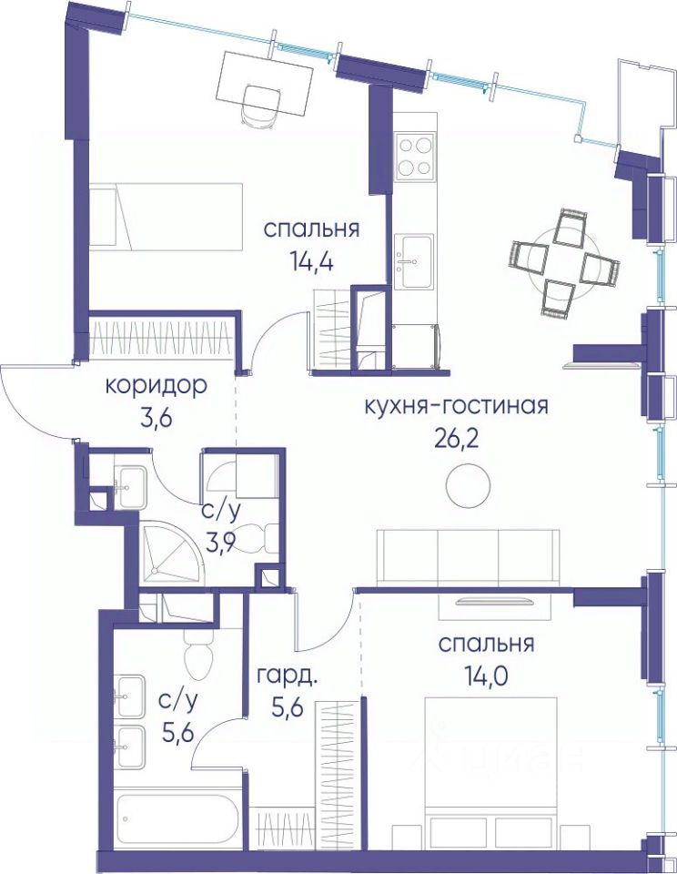• Закрытые общественные пространства: детская комната, спортивный зал, коворкинг, лаунж-зоны.