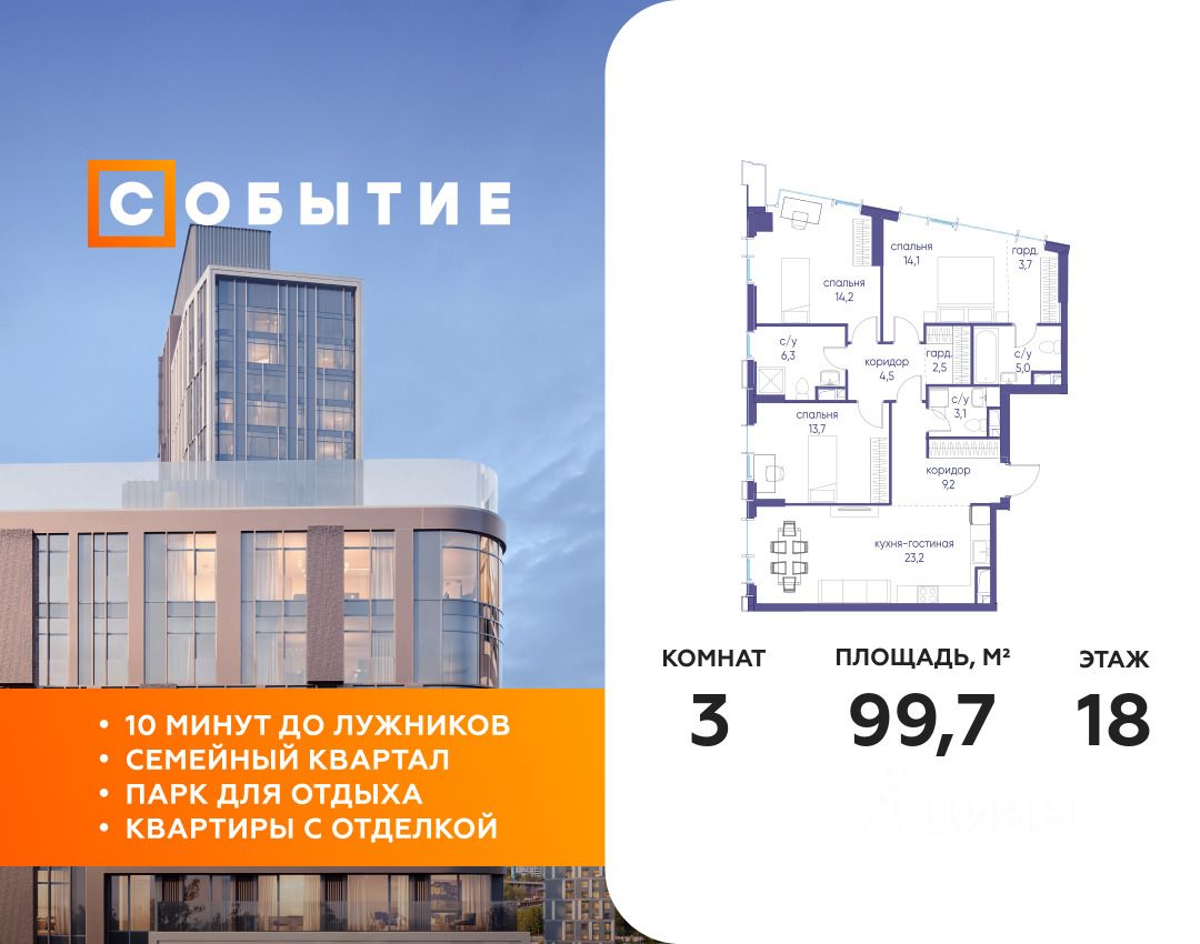 СОБЫТИЕ.6 — финальный дом парк-квартала СОБЫТИЕ на Мосфильмовской. Переезжайте в уже сформированный квартал с готовой инфраструктурой и парком! Премиальный жилой комплекс в престижном районе Москвы предлагает стильную архитектуру, продуманное благоустройство и великолепно разнообразие общественных пространств. Свой парк прямо возле дома!