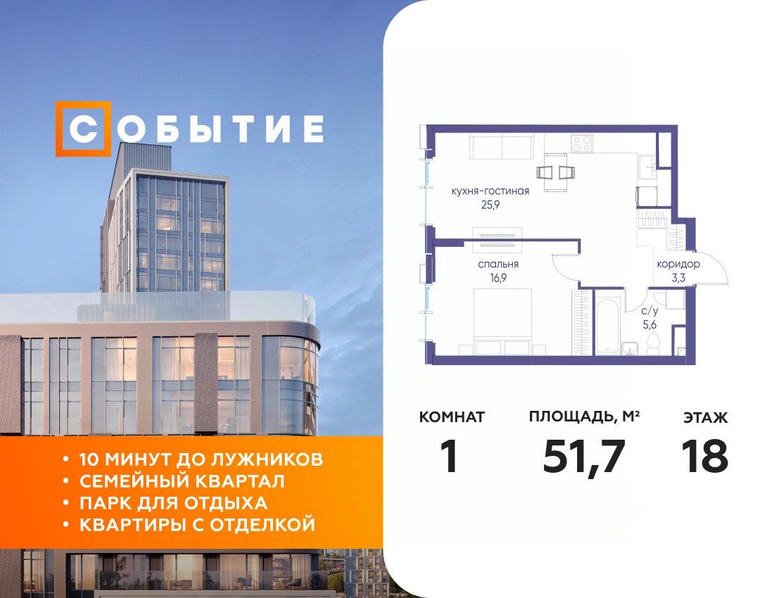 В продаже 1-к квартира от застройщика. Общая площадь 51.70, жилая 16.90, кухня 25.9. Квартира расположена на 18 этаже жилого квартала "Событие-6", корпус 2, Секция 1. Квартира без отделки. Срок сдачи: 4 кв. 2029 года.