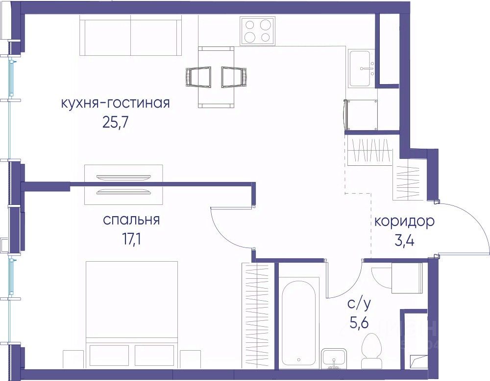 В продаже 1-к квартира от застройщика. Общая площадь 51.80, жилая 17.10, кухня 25.7. Квартира расположена на 22 этаже жилого квартала "Событие-6", корпус 2, Секция 1. Квартира без отделки. Срок сдачи: 4 кв. 2029 года.