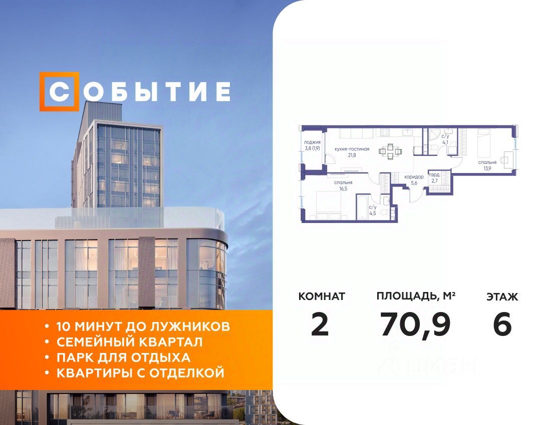 СОБЫТИЕ.6 — финальный дом парк-квартала СОБЫТИЕ на Мосфильмовской. Переезжайте в уже сформированный квартал с готовой инфраструктурой и парком! Премиальный жилой комплекс в престижном районе Москвы предлагает стильную архитектуру, продуманное благоустройство и великолепно разнообразие общественных пространств. Свой парк прямо возле дома!