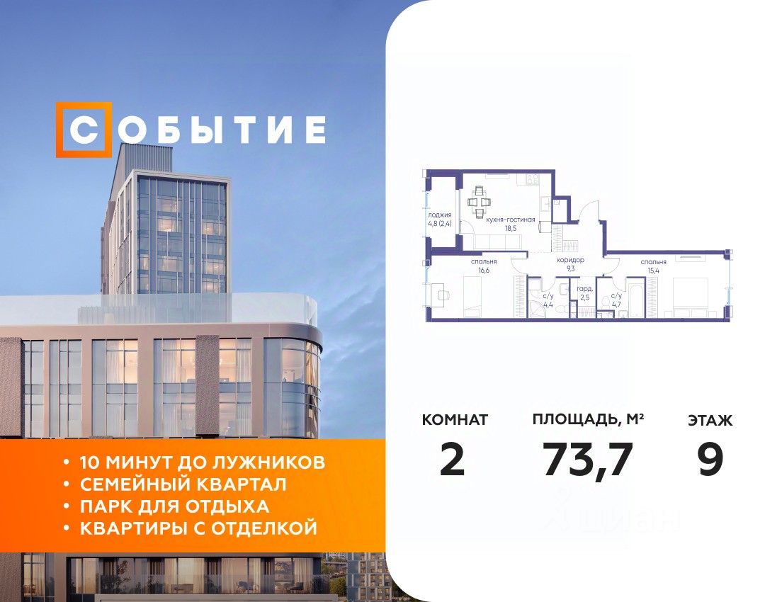 В продаже 2-к квартира от застройщика. Общая площадь 73.70, жилая 30.00, кухня 19. Квартира расположена на 9 этаже жилого квартала "Событие-6", корпус 2, Секция 2. Квартира без отделки. Срок сдачи: 4 кв. 2029 года.
