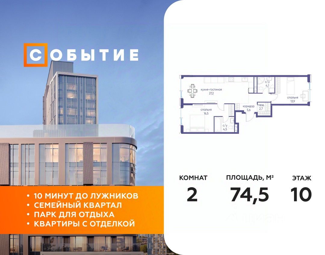В продаже 2-к квартира от застройщика. Общая площадь 74.50, жилая 30.40, кухня 27.2. Квартира расположена на 10 этаже жилого квартала "Событие-6", корпус 2, Секция 2. Квартира без отделки. Срок сдачи: 4 кв. 2029 года.