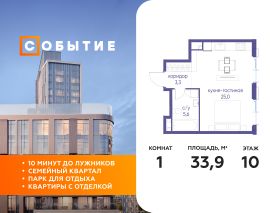 В продаже студия от застройщика. Общая площадь 33.90, жилая 18.80, кухня 6.2. Квартира расположена на 10 этаже жилого квартала "Событие-6", корпус 2, Секция 2. Квартира без отделки. Срок сдачи: 4 кв. 2029 года.