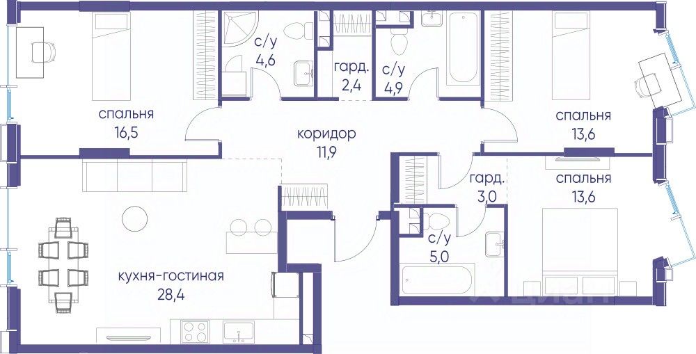 В продаже 2-к квартира от застройщика. Общая площадь 103.80, жилая 46.70, кухня 28.4. Квартира расположена на 3 этаже жилого квартала "Событие-6", корпус 2, Секция 3. Квартира без отделки. Срок сдачи: 4 кв. 2029 года. СОБЫТИЕ.6 — финальный дом парк-квартала СОБЫТИЕ на Мосфильмовской. Переезжайте в уже сформированный квартал с готовой инфраструктурой и парком! Премиальный жилой комплекс в престижном районе Москвы предлагает стильную архитектуру, продуманное благоустройство и великолепно разнообразие общественных пространств. Свой парк прямо возле дома! Архитектура Архитектура СОБЫТИЯ.6 выполнена в ультрасовременном стиле московским бюро Atrium на основе дизайн-кода британских архитекторов LDA Design и UHA London. Дом отличает оригинальная геометрия фасадов, большое остекление и высокие лобби (до 6,2 м) с авторской мебелью и светильниками. Расположение Мосфильмовская улица (Раменки) — один из престижных районов Москвы. Близость к историческому и деловому центру, природным зонам Запада столицы. Транспортная доступность: • 10 мин до Москва-Сити и ТТК; • 15 мин до Садового кольца; • 25 мин до аэропорта Внуково; • 7-10 мин до станций метро "Аминьевская" и "Мичуринский проспект". Инфраструктура: • парк "Событие" (12 га, финалист конкурса Правительства Москвы) с беговыми (1,5 км) и велодорожками (2,7 км), экотропой (1,6 км), площадками, лекторием; • школа, детский сад, магазины, салоны красоты, рестораны (к моменту заселения); • мультидвор с игровыми и спортивными площадками, мини-бульваром; • общественная терраса на 10-м этаже (коворкинг, лаунж); • Закрытые общественные пространства: детская комната, спортивный зал, коворкинг, лаунж-зоны. Паркинг 256 мест для жителей (48 — для электромобилей), 24 гостевых (5 — для электромобилей), мойки колес, кладовые, зоны для велосипедов. Окружение Парки и заповедники (Воробьёвы горы, Матвеевский лес и др.), МГУ, театр им. Н. И. Сац, стадион "Лужники". Безопасность Видеонаблюдение, контроль доступа, видеодомофоны, консьерж-сервис 24/7, системы пожарной безопасности и мультисервисная оптическая сеть.