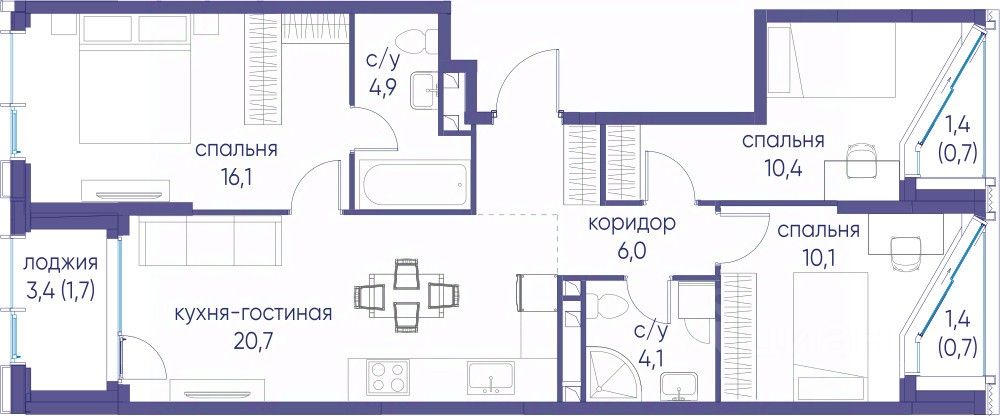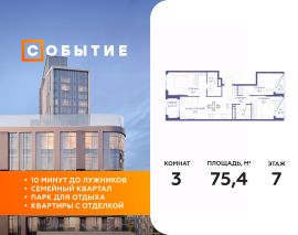 В продаже 3-к квартира от застройщика. Общая площадь 75.40, жилая 36.60, кухня 21.1. Квартира расположена на 7 этаже жилого квартала "Событие-6", корпус 2, Секция 3. Квартира без отделки. Срок сдачи: 4 кв. 2029 года.