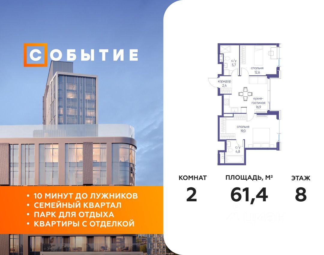 В продаже 2-к квартира от застройщика. Общая площадь 61.40, жилая 31.60, кухня 16.9. Квартира расположена на 8 этаже жилого квартала "Событие-6", корпус 2, Секция 3. Квартира без отделки. Срок сдачи: 4 кв. 2029 года.