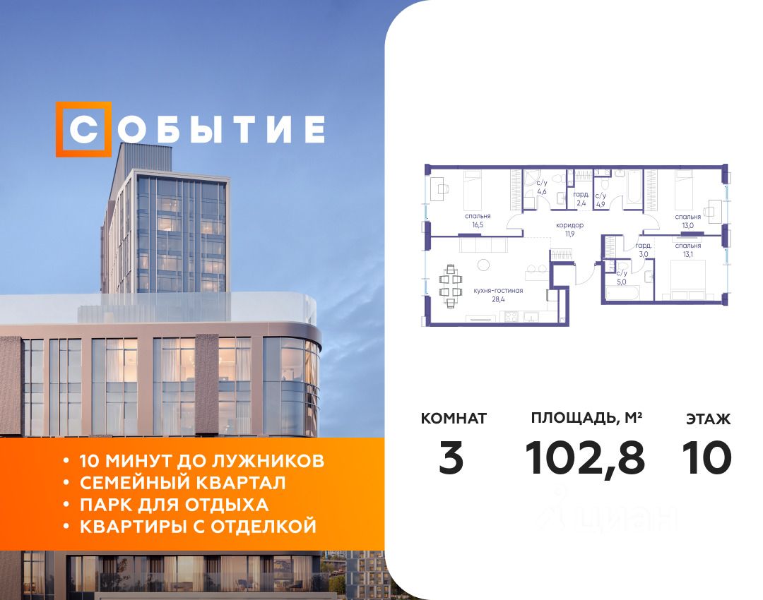 В продаже 2-к квартира от застройщика. Общая площадь 102.80, жилая 45.60, кухня 28.4. Квартира расположена на 10 этаже жилого квартала "Событие-6", корпус 2, Секция 3. Квартира без отделки. Срок сдачи: 4 кв. 2029 года.