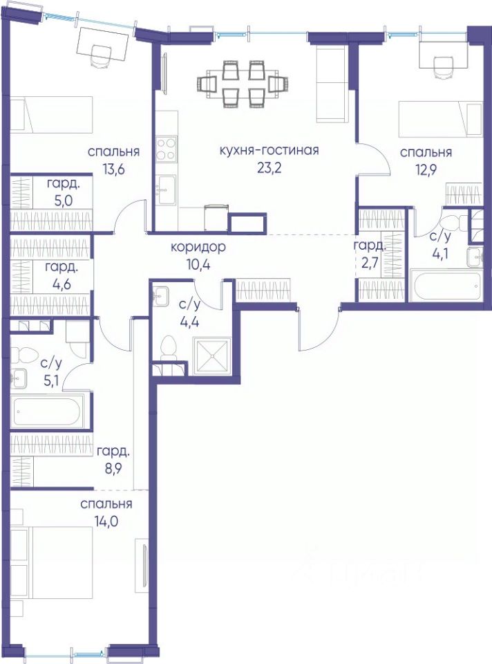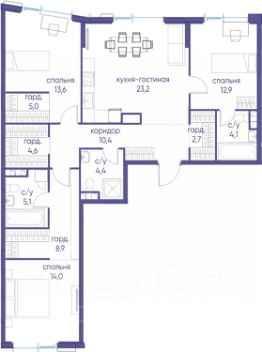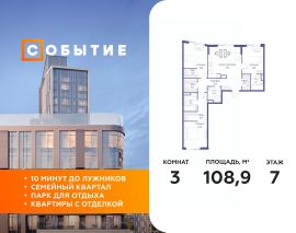 В продаже 3-к квартира от застройщика. Общая площадь 108.90, жилая 54.40, кухня 23.1. Квартира расположена на 7 этаже жилого квартала "Событие-6", корпус 2, Секция 4. Квартира без отделки. Срок сдачи: 4 кв. 2029 года.